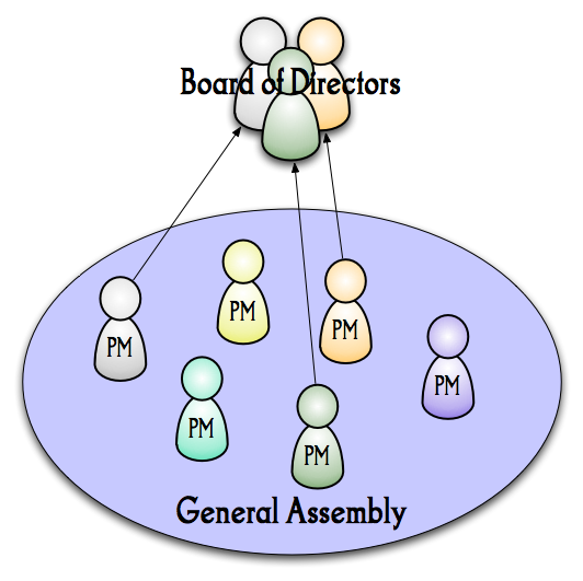 The first point of confusion for a lot of people is terminology; the difference between Permanent Members (PM) , the General Assembly (GA), and the Board of Directors (BOD). To state it plainly, everyone in the Association is part of the GA. The individuals in the GA are referred to as PM. The PMs then decide who amongst them will be on the BOD. The BOD are the real movers and shakers who vote on policies and how we spend our money. Here is a li’l graphic to help out: